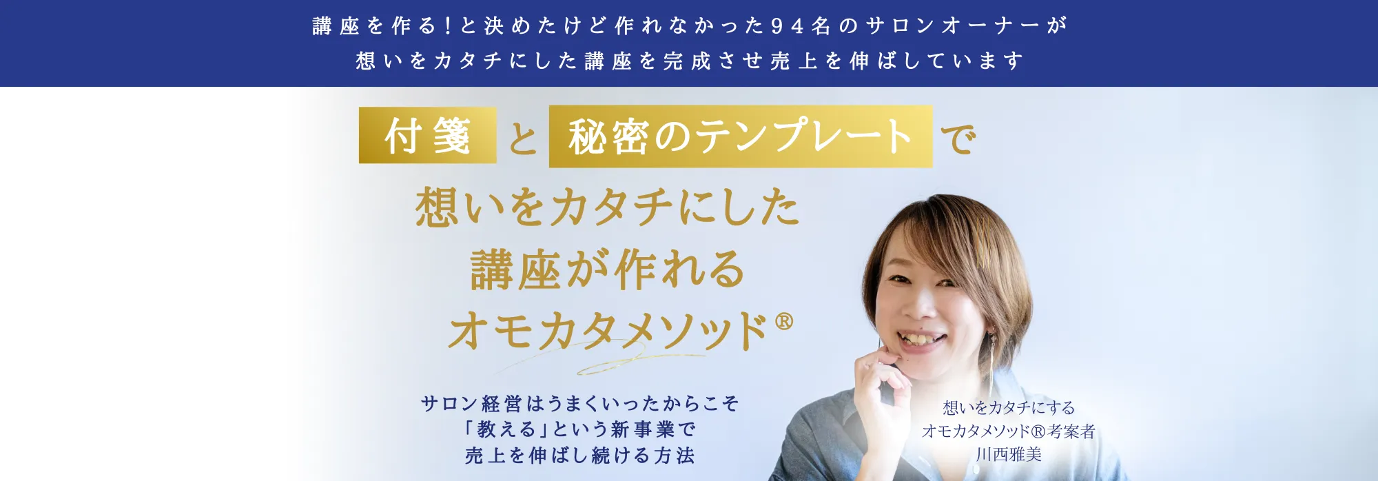 私、川西まさみおよびオモカタメソッドでは、自分らしい講座でサロン以外の売上の柱を作り上げることができるサロンオーナーを増やしたい、その想いで講座ビジネスに必要なマーケティング、本命商品の作り方から集客方法、ビジネスの土台である「在り方」について動画教材とリアルに意見交換ができる場を提供しています。