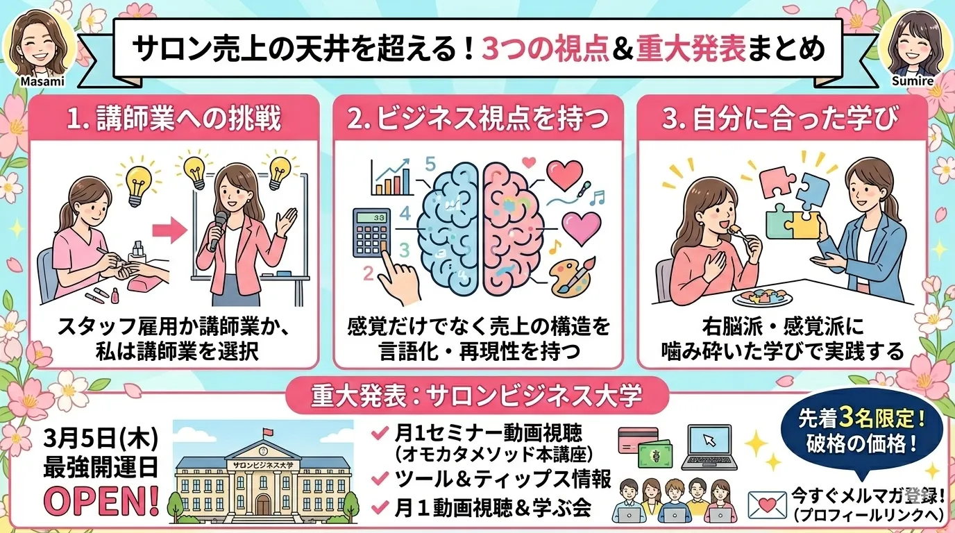 あなたの夢を叶えるのも同じように、「ひとりで頑張らない」「人の力を借りてみる」ことで、どんどん実現していく世界を、サロンビジネス大学で体感してほしいと願っています。