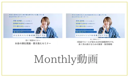 サロン経営者・治療家がオンライン講座を始めるために必要なビジネスの知識とマインドが学べます。Monthly動画コーナーにて、2ヶ月間視聴可能です。
